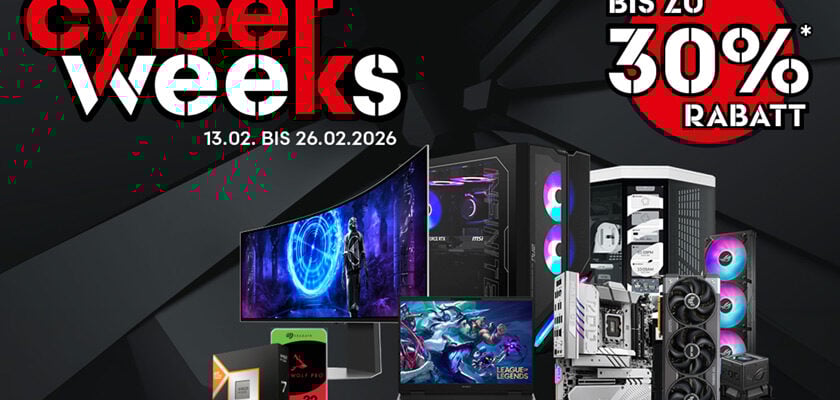 Vom 13. bis zum 27. Februar (jeweils 9:00 Uhr) kannst du dir bei den ALTERNATE-Cyber-Weeks jede Menge attraktiver Angebote aus den Bereichen Hardware, Peripherie, PCs und Notebooks sowie weiteren ausgewählten Kategorien sichern. Dich erwarten starke Rabatte von bis zu 30% auf die UVP! Die perfekte Gelegenheit, wenn du schon länger über ein PC-Upgrade nachdenkst oder dir endlich ein neues Setup gönnen möchtest. Als besonderes Schmankerl entfällt in den Aktions-Wochen nämlich auch die Baupauschale im ALTERNATE PC-Konfigurator! Heißt für dich, 199€ und viel Zeit und Mühe für den Zusammenbau gespart.