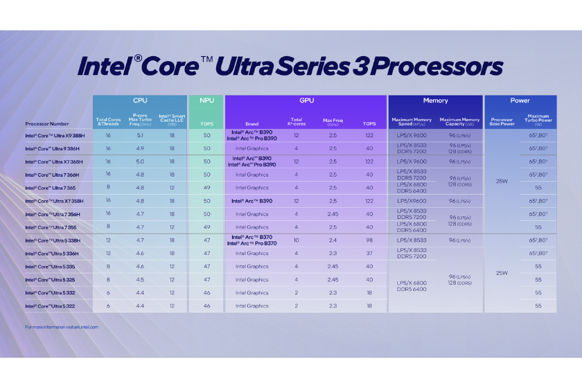 Die Prozessoren der Intel Core Ultra Series 3 kommen diesmal ohne 15 W U-Klasse aus und setzen stattdessen auf höhere Basisleistung in Höhe von 25 W.