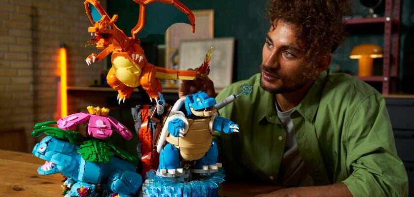 Bisaflor, Glurak und Turtok – die Endentwicklungen der ersten drei Starter haben ebenfalls ein eigenes LEGO-Set spendiert bekommen. Dieses setzt sich aus insgesamt 6.838 Einzelteilen zusammen. Dabei thront jedes Pokémon in einem passenden Biom. Bisaflor im Dschungel, Turtok am Strand und Glurak auf einem Vulkan.