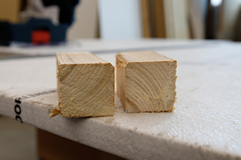 Zum Einsatz kam zunächst das mitgelieferte Holz-und-Metall-Blatt, das sich zwar zuverlässig durchs Material arbeitete, dabei aber etwas hakelig und unruhig wirkte. Die Säge kam problemlos durch, allerdings nicht ganz so sauber, wie man es von einem Profi-Gerät erwarten würde. Die Schnittkante war fein, aber leicht ausgefranst – für grobe Arbeiten ausreichend, für präzise Schnitte jedoch ausbaufähig.